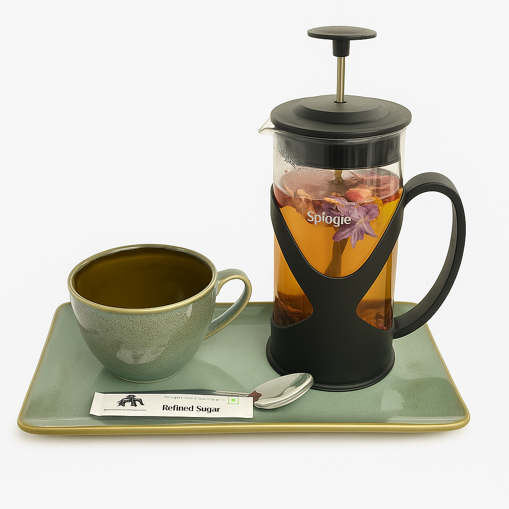 A gentle escape in every sip, this floral and fruity infusion brings together the romantic aroma of rose, the citrusy brightness of lemon verbena, and the sweet serenity of apple and orange blossom. Enhanced by the warmth of cinnamon and the softness of borage flowers, it’s the perfect tea for unwinding and restoring inner balance.