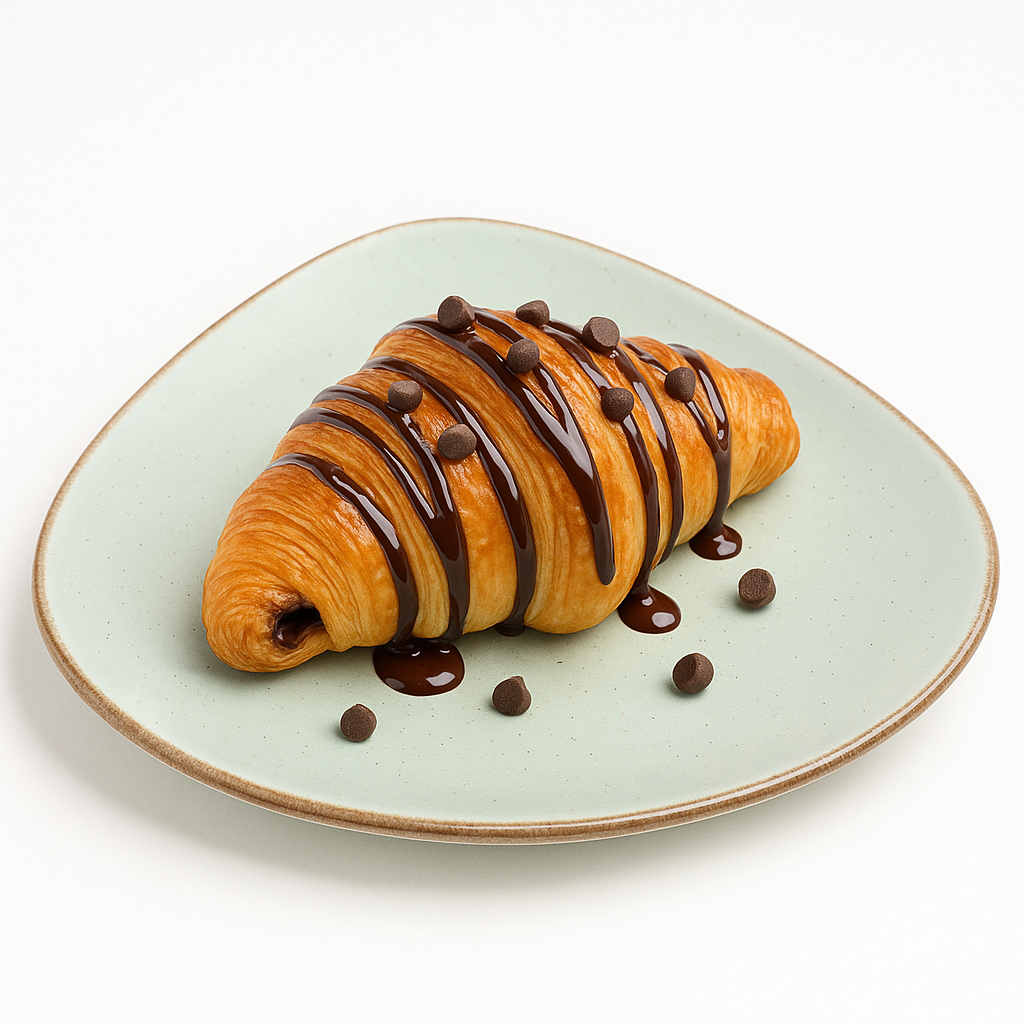 Freshly baked croissant filled with creamy Nutella, topped with smooth chocolate sauce and chocolate chips for the ultimate indulgence.
